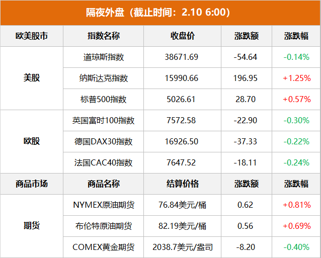 商品市场:国际油价上涨。截至当天收盘,纽约商品交易所3月交货的轻质原油期货价格上涨62美分,收于每桶76.84美元,涨幅为0.81%;4月交货的伦敦布伦特原油期货价格上涨56美分,收于每桶82.19美元,涨幅为0.69%。国际金价下跌,纽约商品交易所的主力黄金期货价格9日下跌8.20美元,收于每盎司2038.7美元,跌幅为0.40%。