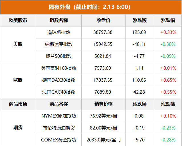 商品市场:纽约油价微涨。截至当天收盘,纽约商品交易所3月交货的轻质原油期货价格上涨8美分,收于每桶76.92美元,涨幅为0.10%;4月交货的伦敦布伦特原油期货价格下跌19美分,收于每桶82美元,跌幅为0.23%。国际金价下跌,纽约商品交易所的主力黄金期货价格12日下跌5.70美元,收于每盎司2033美元,跌幅为0.28%。