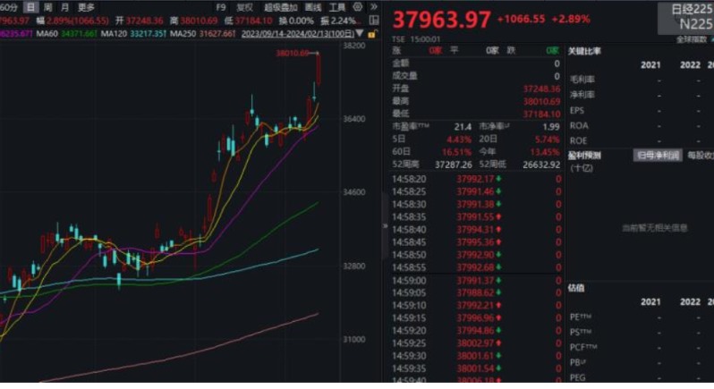 2月13日,日本股市进一步强劲上涨,日经225指数盘中已突破38000点,继续创下最近34年以来新高。