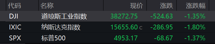 消息一出,美股大跌。截至收盘,道琼斯指数跌1.35%,报38272.75点;标普500指数跌1.37%,报4953.14点;纳斯达克指数跌1.80%,报15655.60点。
