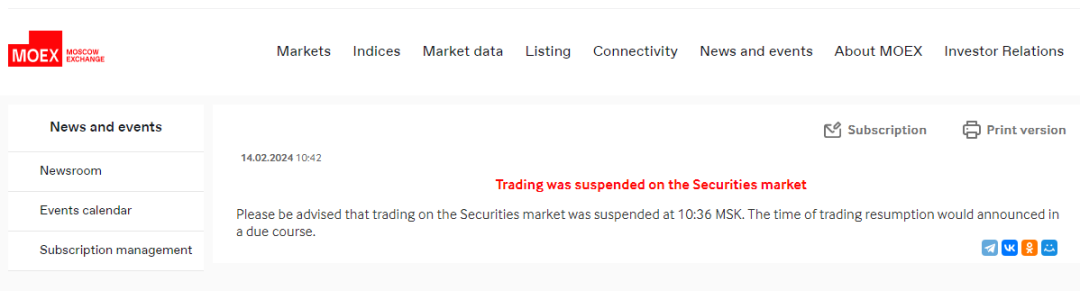 2月14日,莫斯科交易所公告,于当地时间10:36(北京时间15:36)暂停股票市场交易,恢复时间稍后公布。该交易所未披露暂停原因。