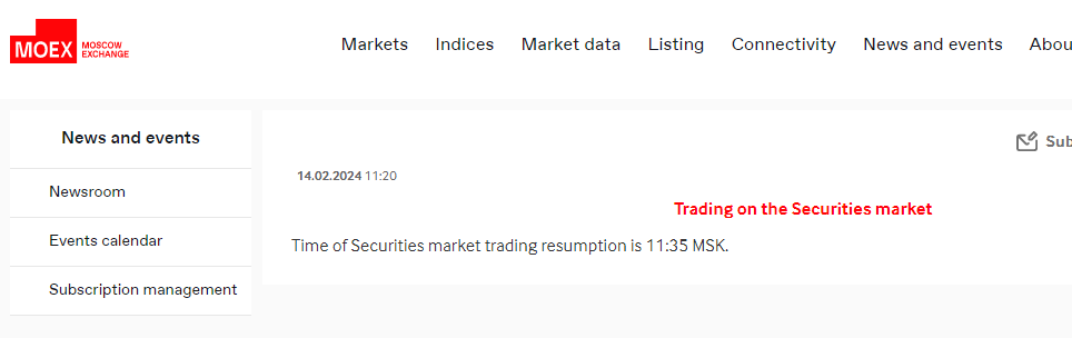 随后该交易所公告,将于莫斯科时间11:35(北京时间16:35)重新启动股票市场交易。