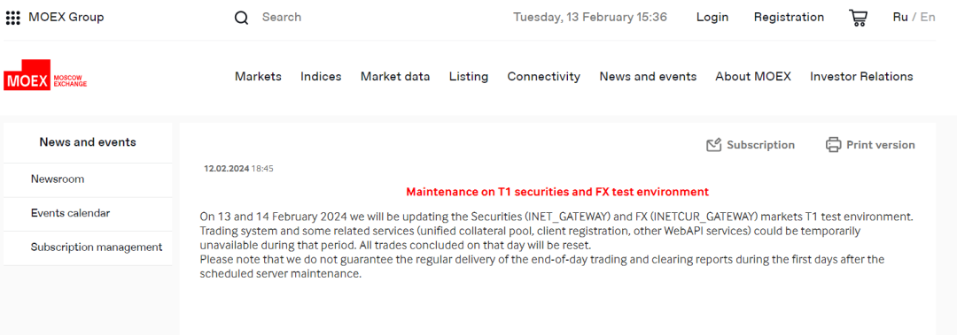 12日,莫斯科交易所曾发布公告称,将于当地时间13日至14日更新证券和外汇市场T1测试环境。在此期间,交易系统和部分相关服务可能暂时不可用。