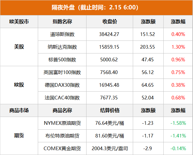 美股市场:美股周三收高,截止收盘,道指涨151.52点,涨幅为0.40%,报38424.27点;纳指涨203.55点,涨幅为1.30%,报15859.15点;标普500指数涨47.45点,涨幅为0.96%,报5000.62点。三大股指均部分挽回了前一交易日蒙受的巨大跌幅。